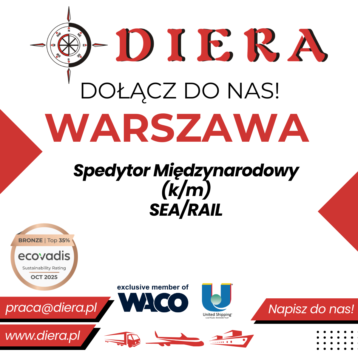 Firma DIERA poszukuje Spedytora / Spedytorki z doświadczeniem w spedycji morskiej i kolejowej do biura w Warszawie. Osoba na tym stanowisku będzie organizować transporty morskie i kolejowe, przygotowywać i weryfikować dokumentację przewozową, a także utrzymywać relacje z armatorami, operatorami i klientami.
