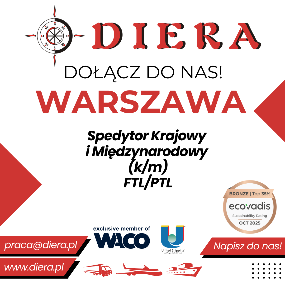 Firma DIERA poszukuje osoby na stanowisko Spedytor / Spedytorka do działu spedycji krajowej i międzynarodowej w Warszawie. Kandydat będzie odpowiedzialny za planowanie i organizację transportów drogowych (FTL/LTL), dobór przewoźników, monitorowanie realizacji zleceń oraz kontakt z klientami i partnerami.